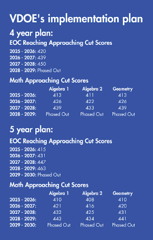 Cut scores are determined by a standard setting process and are established by subject specific committees. This change is planned to phase in over the next few years according to the VDOE’s implementation plan. The board will officially vote on this plan in a business meeting on Oct. 23.